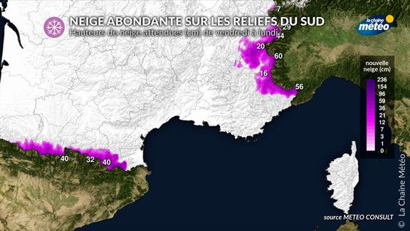 Sous l'influence d'un système dépressionnaire sur le bassin méditerranéen, de l'air humide et instable va venir se bloquer sur les reliefs du sud. Avec l'arrivée progressive d'air froid en altitude, des chutes de neige abondantes sont attendues sur l'est des Pyrénées et le Mercantour et dans une moindre mesure sur les Alpes frontalières.
