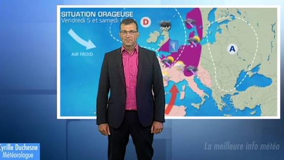 Après le pic de chaleur de jeudi et vendredi, de l'air plus frais va s'infiltrer par le nord-ouest. Au contact des 2 masses d'air des orages vont se produire d'abord dans le nord-ouest vendredi puis en direction de l'est samedi.