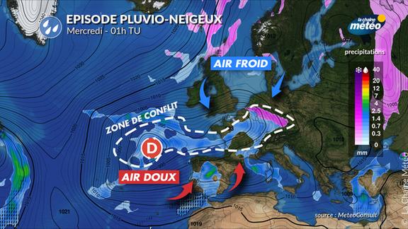 De mardi à jeudi prochain, la France va se trouver au cœur d'un conflit de masses d'air entre le froid qui résiste au nord et la douceur qui s'installe par le sud. Ce contexte entraînera un risque de neige jusqu'en plaine. Quelles régions seront les plus exposées ? Premiers éléments de réponse dans cette vidéo.
