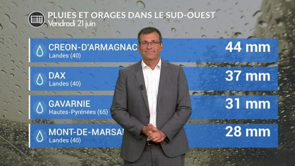 En matinée des pluies soutenues ont touché les Landes avec l'équivalent de 15 jours de pluie par endroits. Des orages très pluvieux ont concerné les Hautes Pyrénées. Le point à la mi-journée avec notre météorologue Cyrille Duchesne.